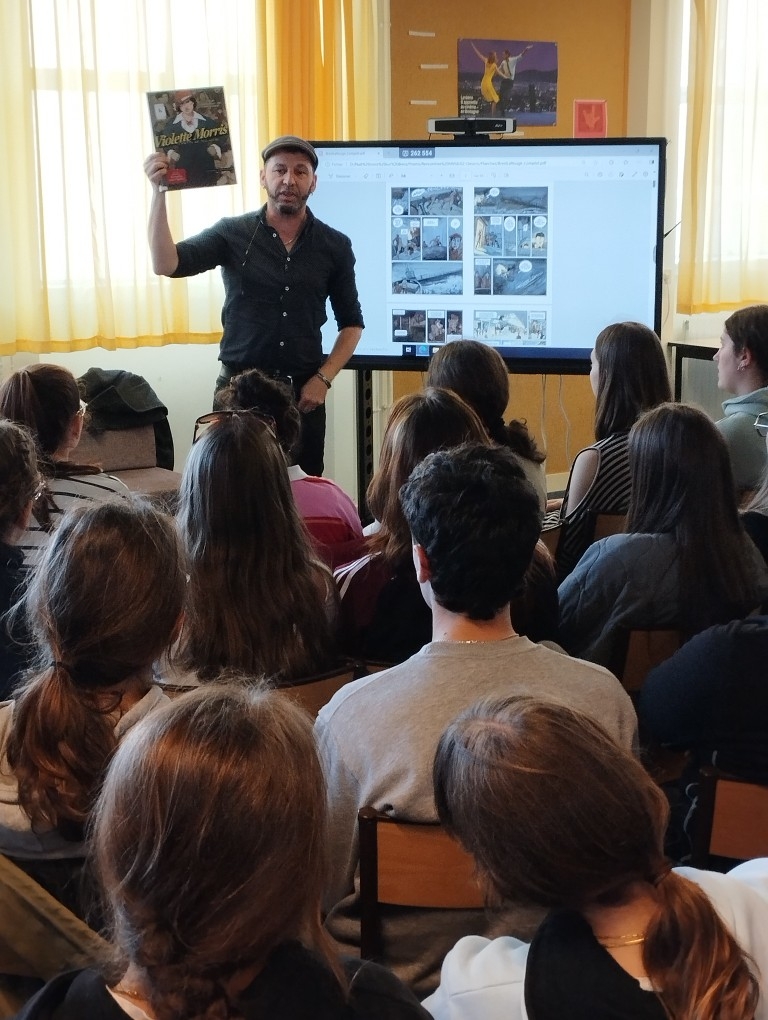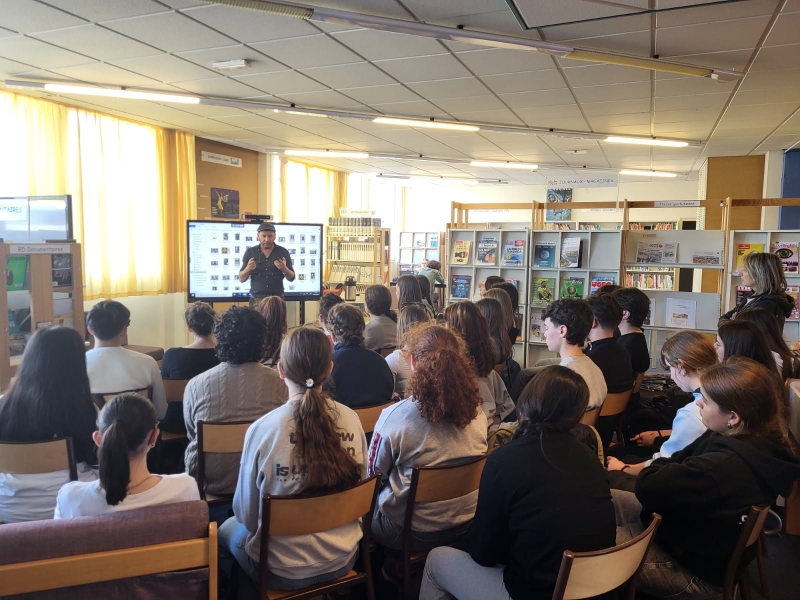 Rencontre au CDI avec KRIS, scénariste de la bande dessinée Nuit noire sur Brest. De chaque côté des Pyrénées, lycéens français et espagnols avaient préparé en amont cet échange autour de cet épisode historique de la guerre civile durant lequel, en 1937, un sous-marin républicain échoué dans le port de Brest s’est retrouvé au cœur d’une crise diplomatique et d’une affaire d’espionnage entre la France et l’Espagne.