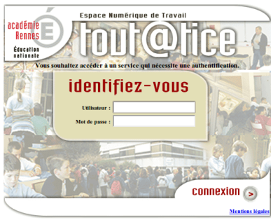 Le site SPIP de votre établissement est intégré à l’ENT académique Toutatice : cela signifie donc que vous pouvez vous identifier sur le site par vos identifiants Toutatice (ceux qui sont utilisés pour accéder au webmail, à iProf ou aux autres applications de l’ENT comme Educhorus, Moodle, etc). Un lien vers le site web de votre établissement vous est présenté dans votre page d’accueil Toutatice