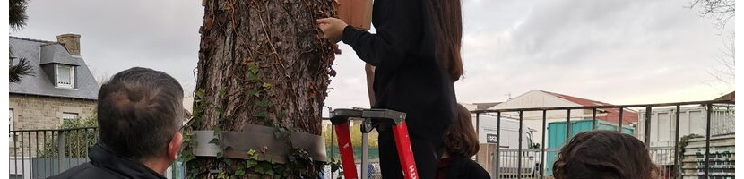 2022-2023 Afin de réduire le nombre de chenilles processionnaires, une intervenante de la Ligue de Protection des Oiseaux, LPO, est venue nous aider à construire des nichoirs à mésanges et à rouges-gorges tout début 2023. Nous les avons posés dans les arbres du lycée avec Loïc, un de nos agents.