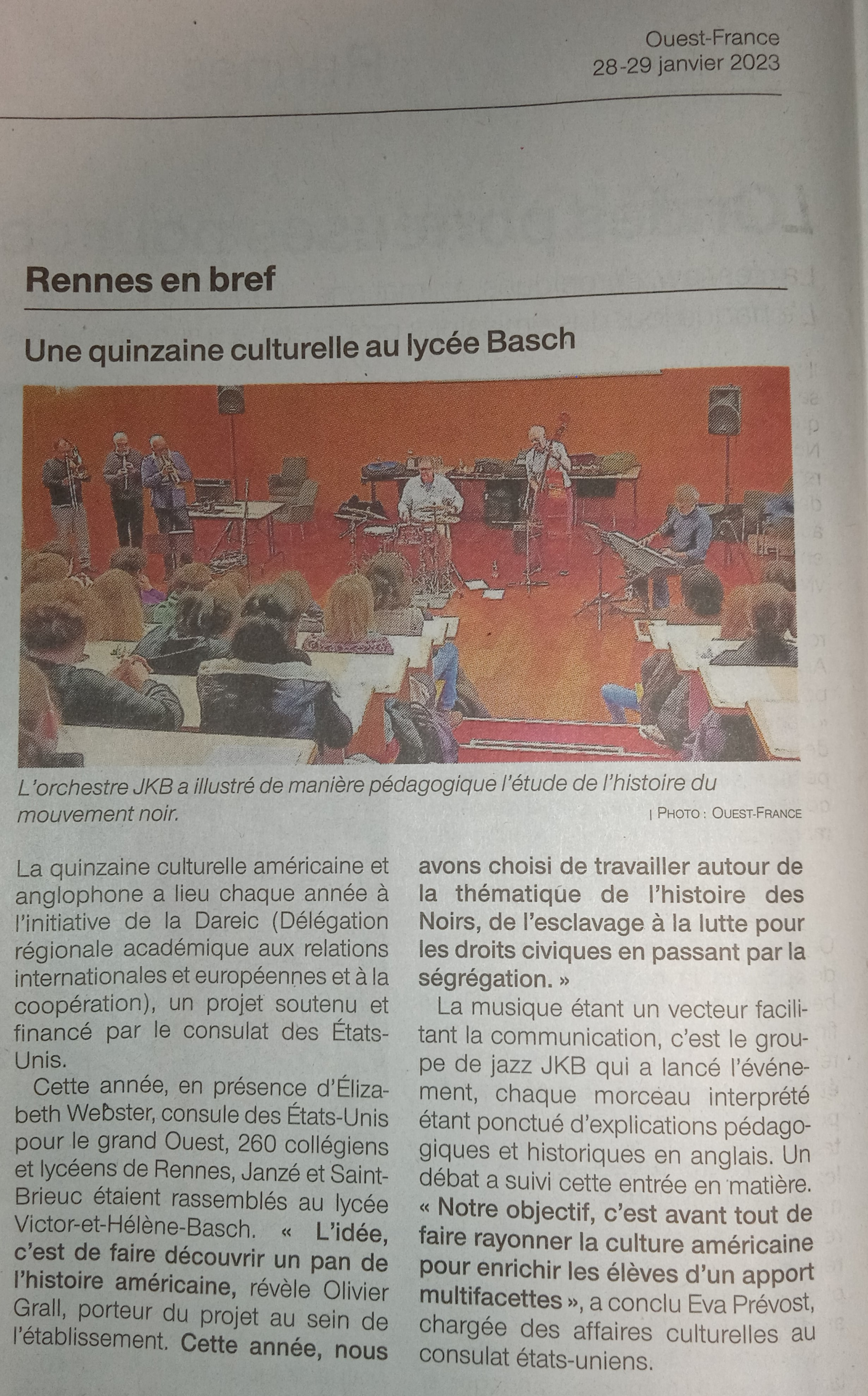 Journée du 26 janvier 2023 à Rennes sur le thème de l’art engagé pour les terminales suivant la spécialité LLCE : street art (visite commentée en anglais par Destination Rennes puis découverte du fond documentaire de l’Institut Franco-Américain), concert de jazz au lycée Victor-Hélène-Basch. Merci à Olivier Grall,professeur en TLLCE pour l’invitation et ce partenariat. Et enfin hip-hop ou plus précisément house dance (spectacle « One Shot » d’Ousmane Sy par la compagnie Paradox-Sal à la Passerelle).
